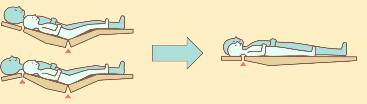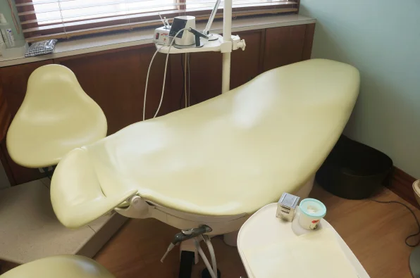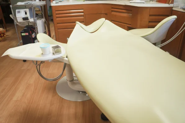 歯科治療というと背折れ式のチェアをイメージされる方がほとんどだと思います。実際、背折れ式を導入している歯科医院がほとんどですので、当院のようなベッド型の診療台に驚かれる方も多いです。  このベッド型の診療台で行う診療は、一般的には水平診療と呼ばれています。  アメリカ人歯科医師、Dr.ダリル・ビーチの考えに基づく診療システムの一つです。  人間が最もリラックスできる姿勢は眠っている時と言われています。その状態に近い、仰向けになっている姿勢で治療が受けられるため、不安感や緊張感の緩和が期待できます。また、人間はその構造上、顔が真上を向いている状態の方がお口を楽に開けやすくなっています。ベッド型では、体格に関わらず頭が同じ位置へくるため、大人も子どもも体への負担が少ないというメリットもあります。歯科医師や助手が歯を斜めからでなく真上から見て対応できるため、より的確な診療を行っていけるのもポイントです。  この診療台には、うがい用の設備を付けていません。これは診療エリアの飛沫汚染を防ぐためで、代わりに患者さんのお口の中でスプレー水による洗浄を行いバキュームで水を吸引します。うがいの代わりに口腔内洗浄をすることは、治療中の歯を他の部位の菌で汚染することを防ぎ、うがいによる時間ロスをなくすことにも役立っています。  また、切削機器等が患者さんから直接見えないように配置されており、これも不安感の軽減に寄与しています。